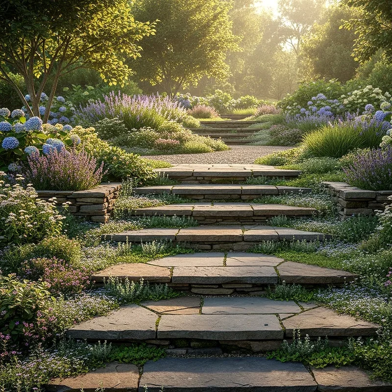 Flagstone steps bring irregular, organic shapes that create wonderfully informal pathways through your garden spaces. Each piece of flagstone is unique, with natural variations in color, thickness, and texture. You can set flagstones directly into soil, sand, or mortar depending on your desired look. The gaps between stones provide planting opportunities for ground covers like thyme or sedum. This material works exceptionally well for winding paths that follow the natural contours of your landscape. Flagstone stays relatively cool underfoot during summer months, making it comfortable for bare feet. The flat surfaces provide stable footing while the irregular edges create a relaxed, cottage garden atmosphere. You'll appreciate how flagstone blends with both formal and casual garden designs seamlessly.