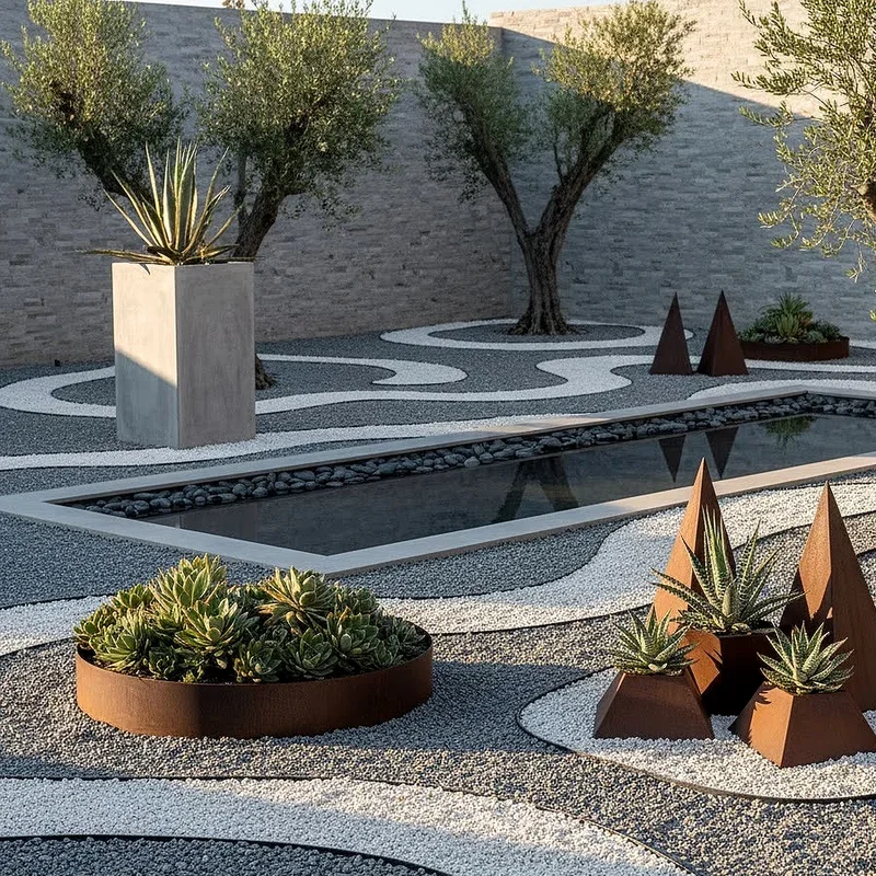 Achieve contemporary sophistication by pairing angular geometric planters with carefully graded gravel in monochromatic color schemes. Select containers in materials like powder-coated steel, concrete, or fiberglass with clean lines and bold shapes such as cubes, cylinders, or pyramids. Plant architectural specimens like snake plants, ornamental grasses, or carefully pruned boxwood spheres to maintain the modern aesthetic. The gravel base should be uniform in size and color, perhaps choosing black basalt or white marble chips for maximum impact. Arrange your containers in grid patterns or asymmetrical groupings that follow mathematical principles of design. This approach transforms your outdoor space into an extension of contemporary interior design, blurring the lines between inside and outside living. The result is a sophisticated garden that feels like an outdoor gallery where every element has been thoughtfully curated for visual perfection.