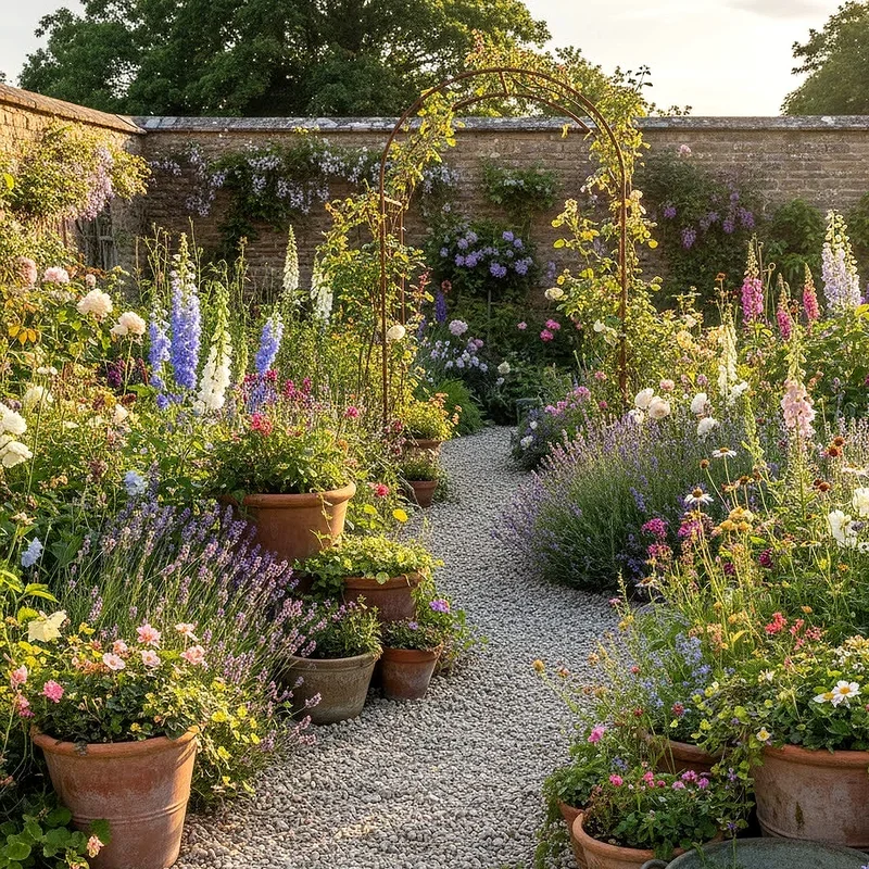 Bring romantic charm to your gravel garden by incorporating weathered vintage pots overflowing with cottage garden favorites like roses, delphiniums, and sweet peas. Hunt for unique containers at flea markets, including old galvanized buckets, enamel washbasins, or chipped ceramic pots that tell a story through their imperfections. The informal arrangement of these containers against a pea gravel backdrop creates that perfectly imperfect English garden aesthetic. Layer different heights by placing some pots on vintage crates or old chairs, allowing trailing plants like ivy geranium or bacopa to cascade downward. Mix annuals and perennials to ensure continuous blooms throughout the growing season, creating a tapestry of color against the neutral gravel canvas. This design celebrates abundance and whimsy, proving that gravel gardens don't have to feel stark or austere when paired with the right container choices.