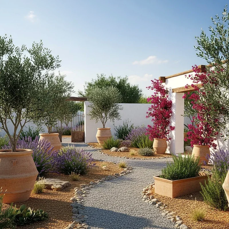 Transform your gravel garden into a sun-soaked Mediterranean retreat by incorporating warm terracotta pots filled with lavender, rosemary, and olive trees. The natural clay color of these containers perfectly complements the neutral tones of gravel while creating that authentic European charm you're after. Position larger pots as focal points along pathways, then cluster smaller ones in groups of three or five for visual impact. Add some ornamental grasses like fountain grass or blue fescue to create movement and soften the hard edges. The beauty of this design lies in its drought tolerance, as Mediterranean plants thrive in well-draining conditions that gravel naturally provides. Your outdoor space will transport you to the Italian countryside every time you step outside, complete with the intoxicating scent of herbs warming in the sun.
