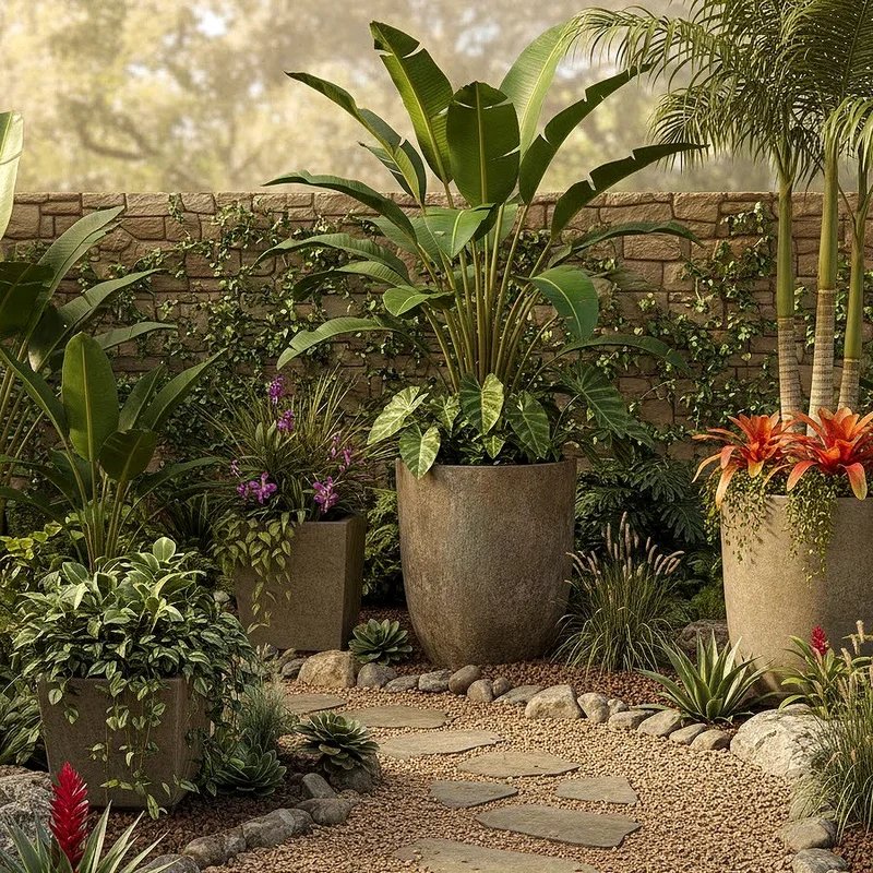 Transport yourself to an exotic getaway by filling oversized containers with lush tropical plants that transform your gravel garden into a verdant paradise. Choose substantial pots in materials like glazed ceramic or resin that can accommodate the root systems of larger specimens like bird of paradise, elephant ears, or banana plants. The contrast between fine gravel and bold tropical foliage creates drama and excitement in your outdoor space. Position these statement containers strategically to create intimate seating areas or to screen less attractive views. Add smaller pots with colorful crotons, bromeliads, or flowering hibiscus to layer the tropical effect. During colder months, the mobility of containers allows you to protect tender plants by moving them indoors or to sheltered locations. Your backyard will feel like a resort destination where every day is a vacation from the ordinary world beyond your garden gates.