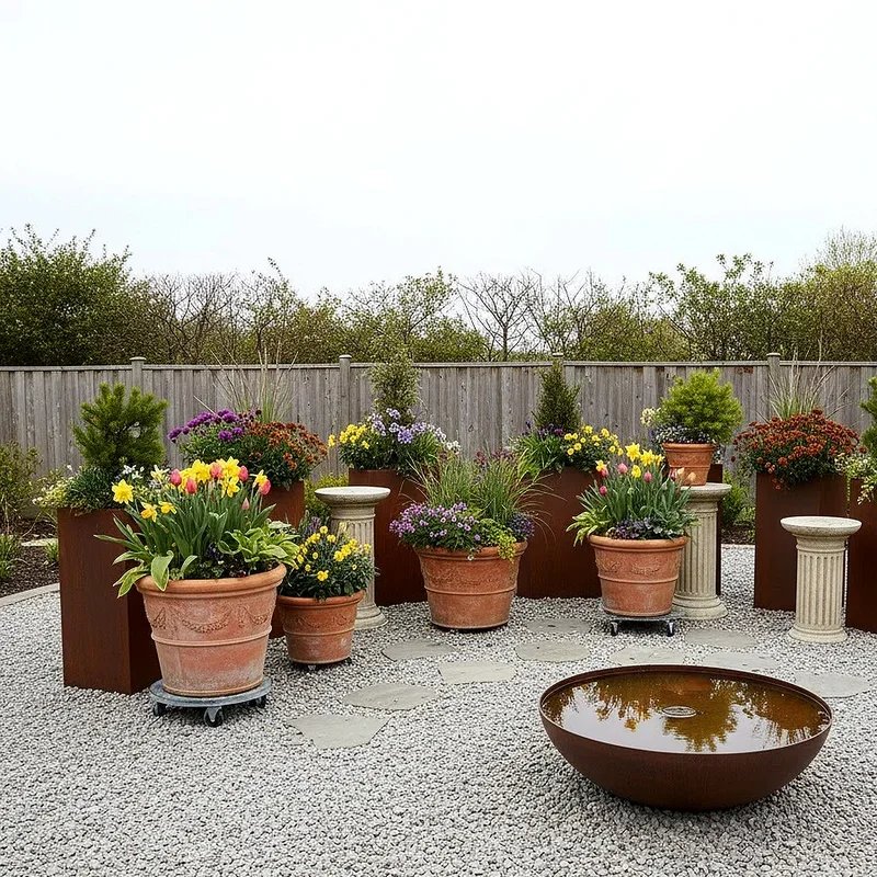 Design a dynamic gravel garden that evolves throughout the year by using lightweight, moveable containers that you can easily rearrange and replant seasonally. Choose pots with built-in wheels or place them on plant dollies to facilitate movement without strain, allowing you to refresh your garden's look regularly. Plant spring bulbs for early color, switch to summer annuals for peak season display, then transition to fall mums and winter evergreens. The stable gravel base provides a consistent backdrop while your container arrangements change with the seasons or your mood. Store off-season containers behind screens or in less visible areas, rotating them into prime positions when their time comes. This flexible approach means you're never stuck with a static design and can experiment with different combinations throughout the year. Your garden becomes a living canvas that reflects the changing seasons while maintaining its fundamental structure through the permanent gravel foundation.