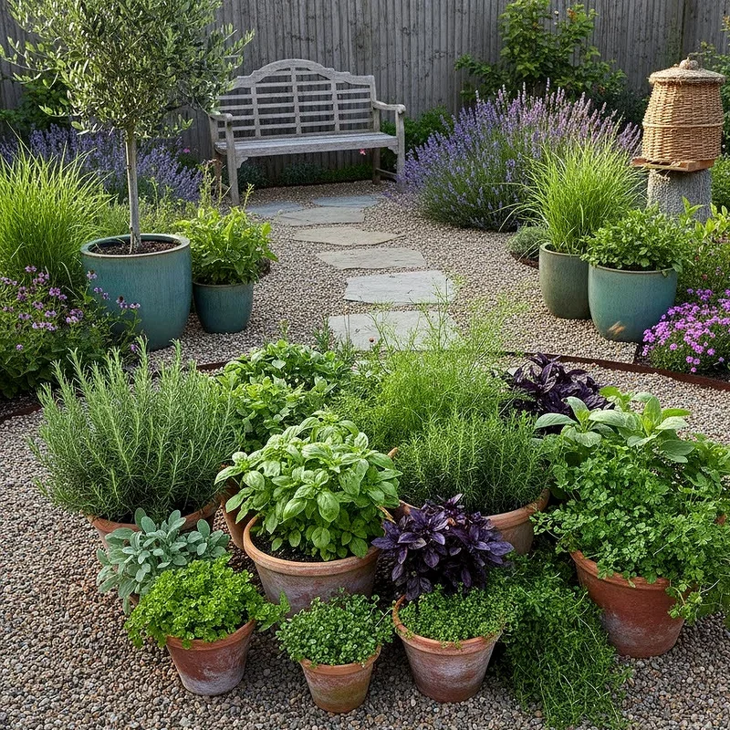 Transform your gravel garden into a culinary paradise by arranging practical containers filled with aromatic herbs within easy reach of your kitchen door. Choose pots with good drainage in materials like terracotta or glazed ceramic that regulate soil moisture for optimal herb growth. Plant a mix of Mediterranean herbs like thyme, oregano, and sage alongside annual favorites such as basil and cilantro. The gravel mulch reflects heat upward, creating the warm microclimate that many herbs prefer while preventing soil splash during watering. Organize containers by use, grouping pizza herbs together or creating a dedicated tea garden section with mint, chamomile, and lemon balm. Label each pot with decorative markers to identify herbs and add charm to the practical display. Your herb garden becomes both a beautiful feature and a functional extension of your kitchen, providing fresh flavors just steps away from your cooking space.