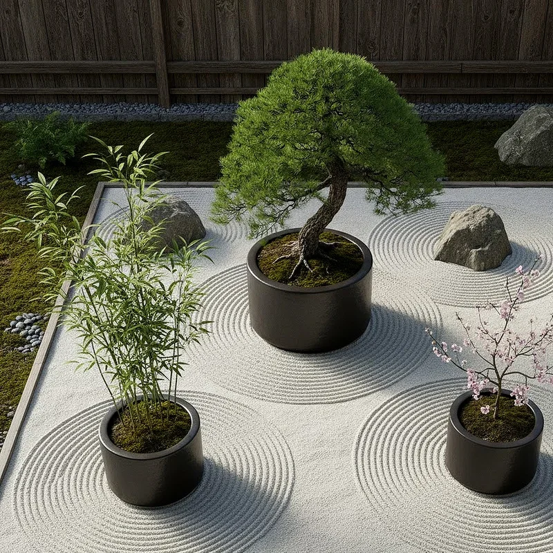 Create a serene sanctuary in your backyard by combining raked gravel patterns with carefully placed ceramic planters housing miniature trees and bamboo. This design philosophy embraces simplicity and balance, using smooth river rocks and fine gravel to represent water elements while glazed ceramic pots add refined elegance. Choose containers in muted colors like sage green, charcoal gray, or soft blue to maintain the peaceful atmosphere. Plant dwarf Japanese maples, small pines, or ornamental bamboo to achieve authentic Asian garden aesthetics. The key to success here involves restraint, so resist the urge to overcrowd your space with too many elements. Instead, focus on creating negative space that allows each planted container to shine as an individual work of art. Your zen garden will become a meditative retreat where stress melts away amid the harmonious blend of texture and form.