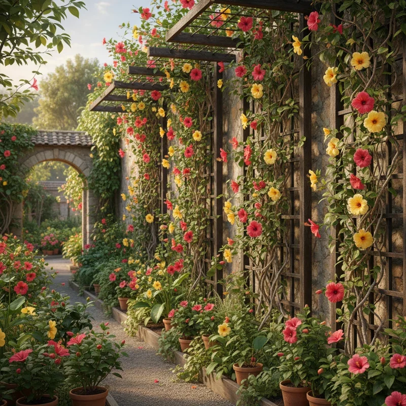 Think hibiscus only grows as shrubs? Some varieties naturally climb or can be trained to grow vertically, perfect for small spaces or adding height to your garden design. While true climbing hibiscus species are rare, you can train standard varieties along trellises, arbors, or pergolas with proper support and pruning techniques. Start young plants near your chosen structure and gently tie new growth to supports using soft plant ties. Prune strategically to encourage upward growth rather than bushy spread. This vertical approach works brilliantly for covering unsightly walls or fences while maximizing limited ground space. Imagine sitting beneath a hibiscus-covered arbor, surrounded by cascading blooms that create a living ceiling of color. Your vertical hibiscus display becomes a stunning focal point that draws eyes upward.