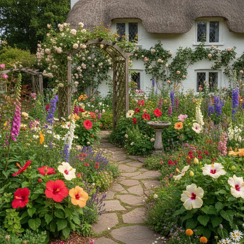 Inject tropical flair into the romantic chaos of a cottage garden by weaving hibiscus throughout traditional plantings. While hibiscus might seem too exotic for this style, Rose of Sharon varieties blend beautifully with cottage garden favorites like roses, delphiniums, and hollyhocks. Let them self-seed for that wonderfully wild cottage garden look, or control their spread for a more managed appearance. Plant them near garden gates or along picket fences where their blooms can spill over boundaries. Mix in herbs and vegetables for that practical cottage garden approach, as hibiscus flowers and leaves are edible in many varieties. Their late summer blooms extend the cottage garden's flowering season when many traditional plants have finished. This unexpected combination brings fresh energy to a classic garden style while maintaining its charming, lived-in appeal.