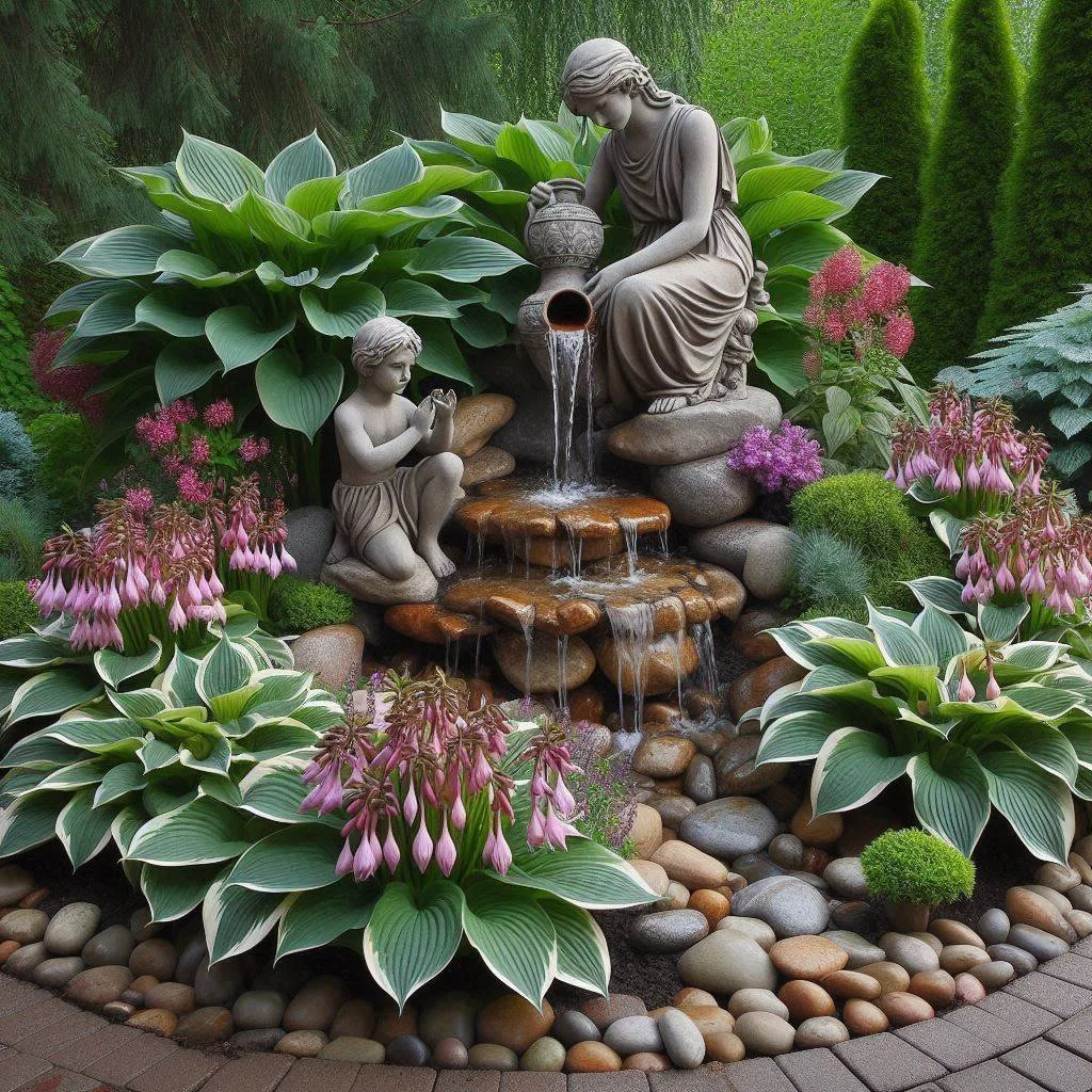 15. Hostas with Statues or Garden Art for a Personal Touch
