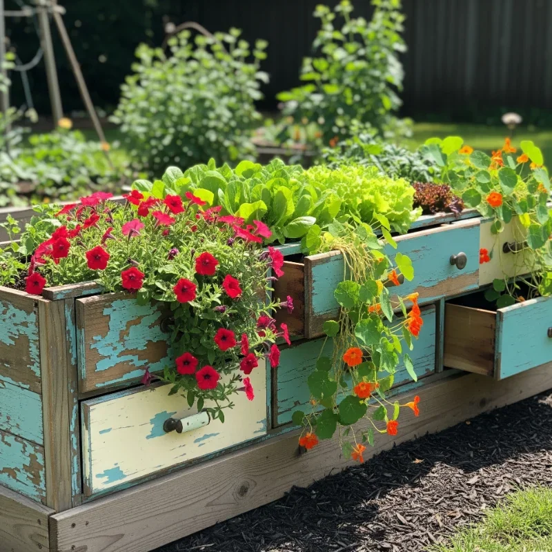 Before tossing that broken dresser, consider its drawers as ready-made planter boxes! Wooden drawers offer perfect dimensions for raised beds while adding vintage character to gardens. Sand and seal wood for weather protection, drill drainage holes, and fill with soil. Different drawer sizes create varied planting depths for diverse crops. Stack drawers pyramid-style for vertical interest or arrange at ground level for traditional beds. Paint them bright colors or leave natural for rustic appeal. The built-in structure eliminates construction time while providing sturdy sides. Metal handles become convenient grips for moving beds seasonally. This upcycling approach costs nothing if using your own furniture or just a few dollars at thrift stores. Line with plastic for longer life while maintaining drainage. Your unique garden beds become conversation pieces while keeping furniture from landfills. Who knew bedroom furniture could grow vegetables?