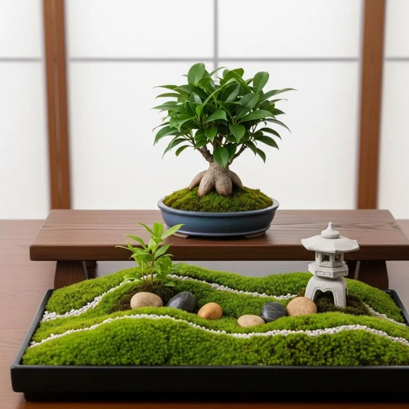 Create miniature landscapes with Japanese moss gardens that capture forest floors in shallow containers or glass terrariums. These living carpets require minimal soil and space while providing maximum tranquility through their velvety green surfaces. Choose cushion moss, sheet moss, or mood moss to build rolling hills and valleys that mirror Japanese garden aesthetics. The high humidity requirements make covered terrariums ideal, creating self-sustaining ecosystems requiring minimal intervention. Watching moss slowly spread becomes lesson in patience and natural time scales. Add small stones, miniature figurines, or tiny bridges to create scenes inspiring contemplation and storytelling. These portable gardens fit anywhere: desktops, shelves, or coffee tables, bringing nature's carpet indoors. The simple care routine involves occasional misting and ensuring adequate but not direct light.