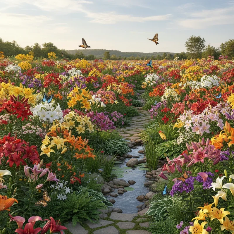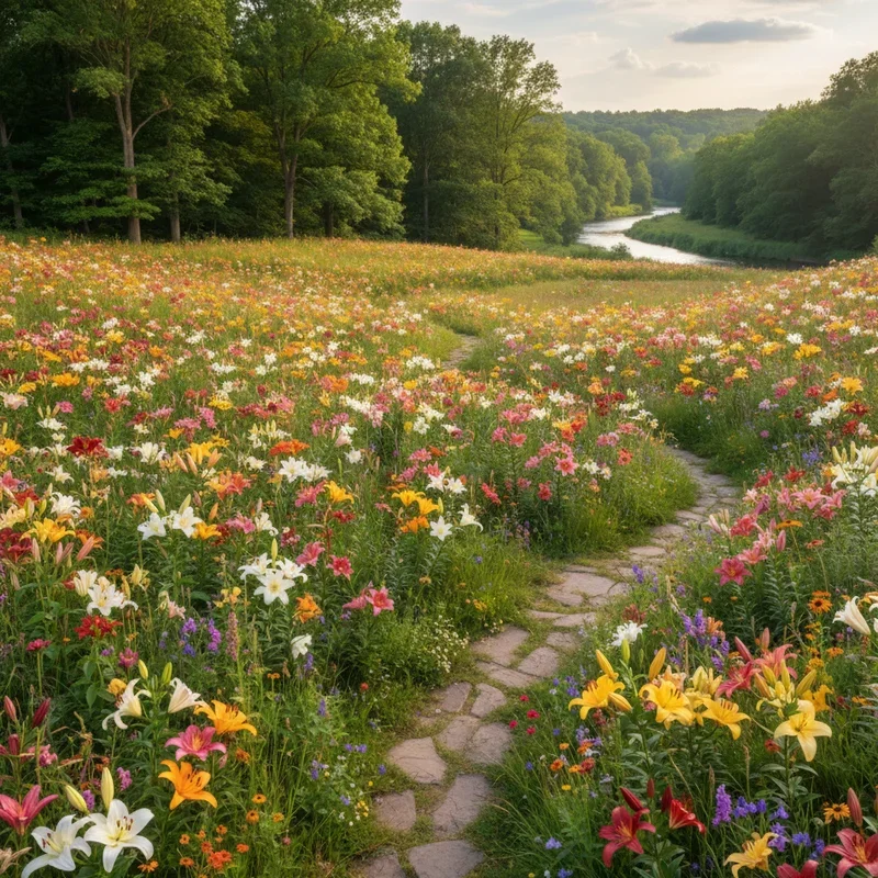 Let lilies spread naturally through meadow-style plantings where they mingle with ornamental grasses and wildflowers for effortless, organic beauty. Choose species lilies and hardy hybrids that multiply readily without becoming invasive in your climate. Scatter bulbs randomly rather than in patterns, mimicking nature's own planting style for authentic meadow appearance. Combine with native grasses that provide support for lily stems while adding movement and texture. Include self-sowing annuals like cosmos and zinnias that fill gaps and extend the blooming season. Mow paths through your meadow for intimate exploration and better viewing angles. Allow seed heads to remain for winter interest and bird food. Your naturalized lily meadow becomes a low-maintenance landscape that grows more beautiful each year as bulbs multiply and combinations evolve naturally.