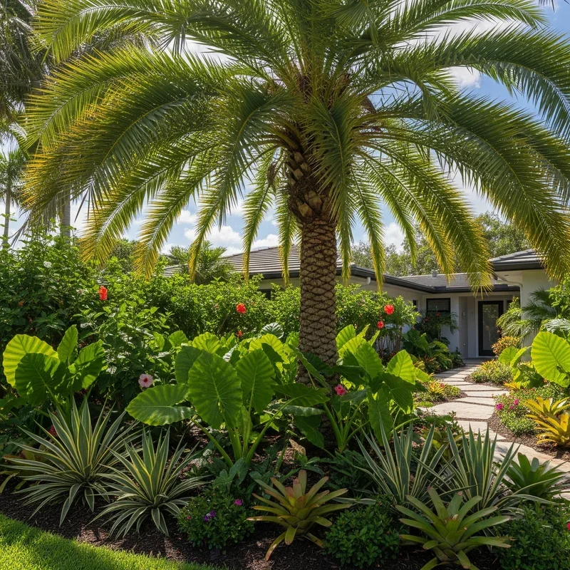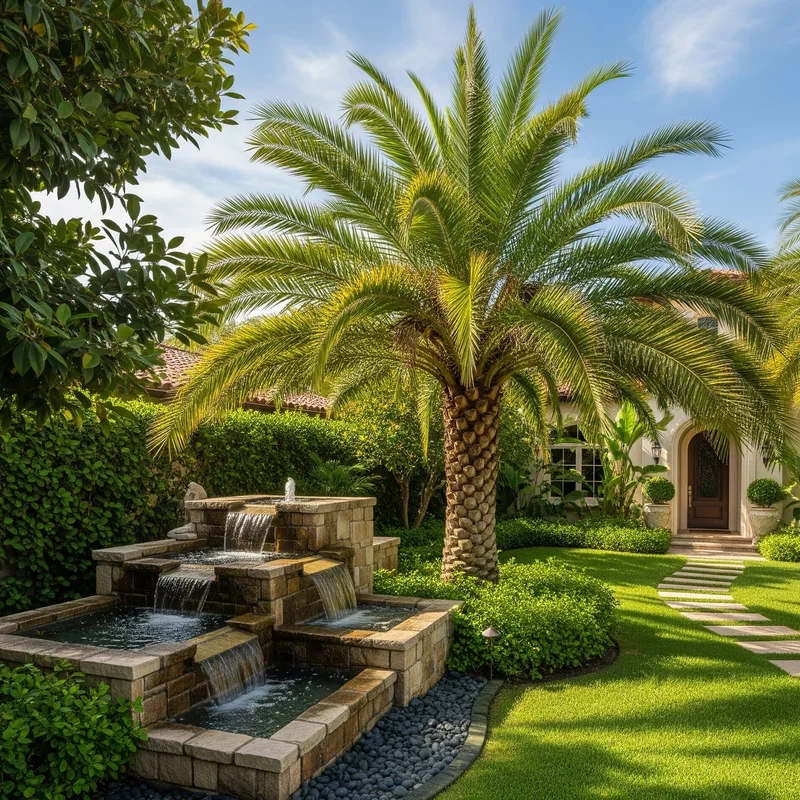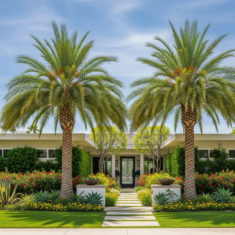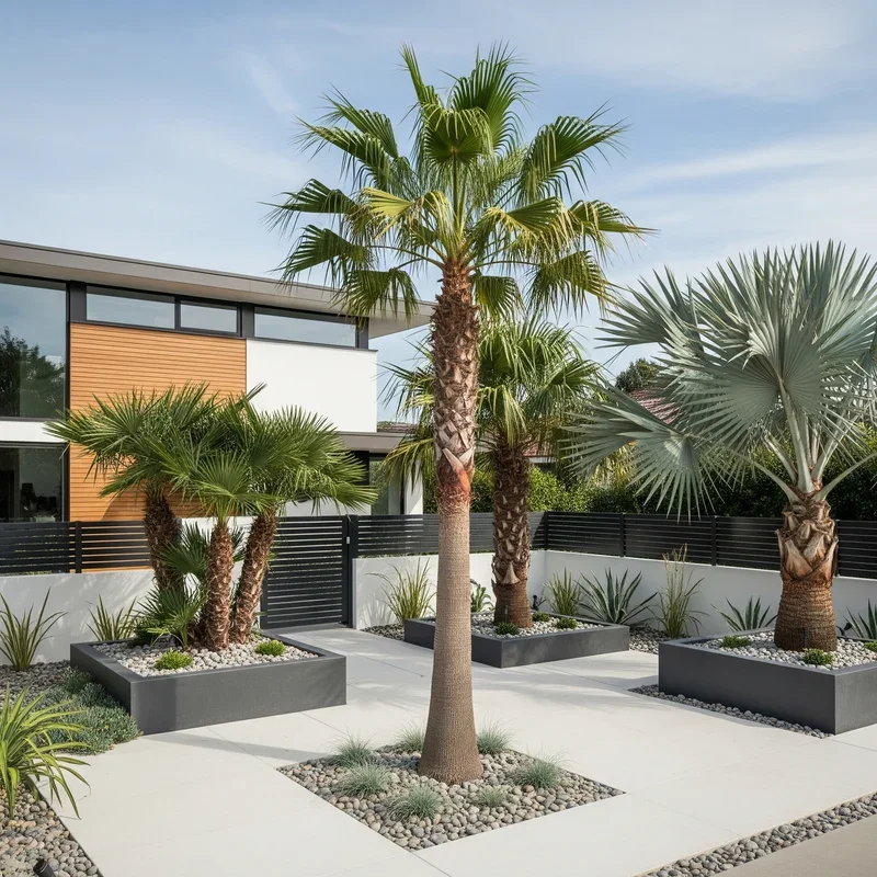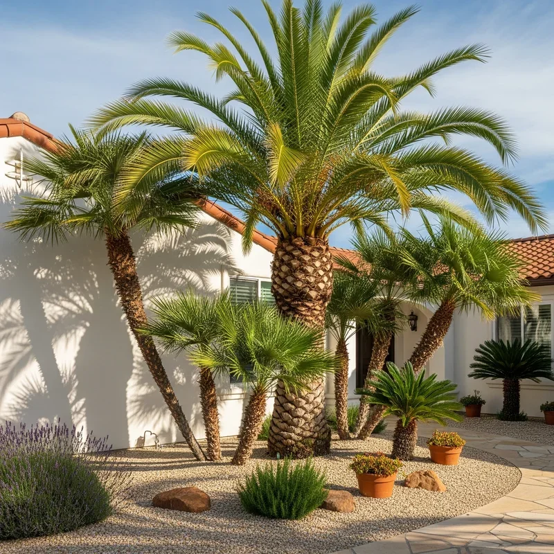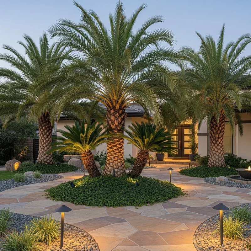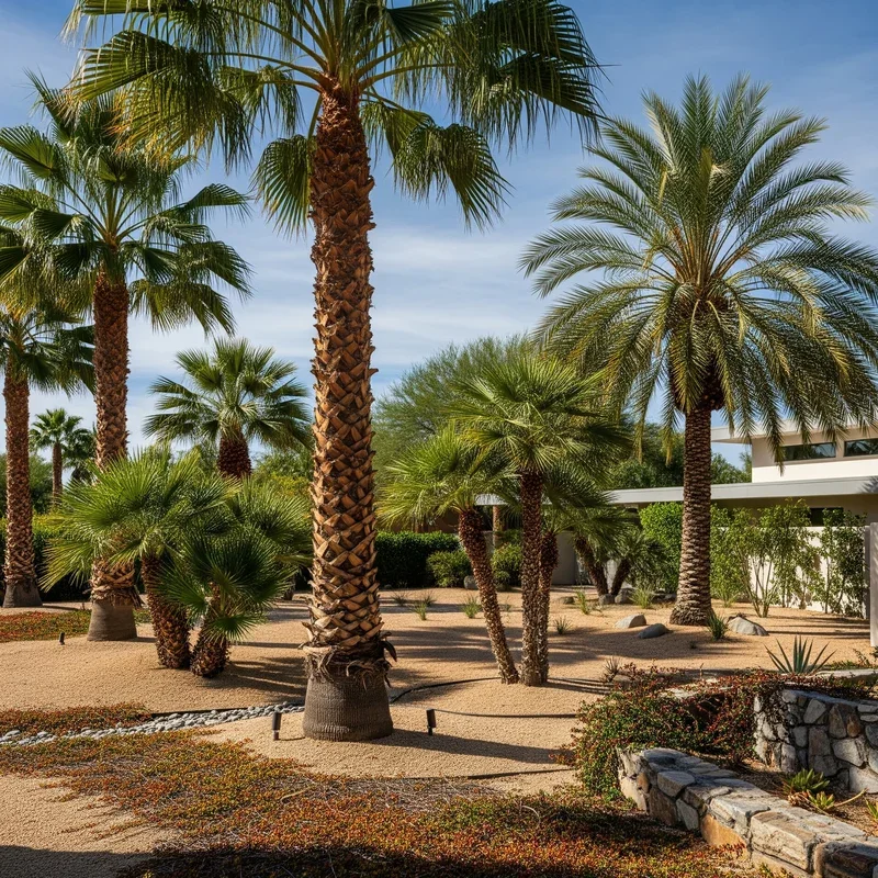 Embrace water-wise landscaping with desert palms that thrive in arid conditions while delivering tropical aesthetics. Mediterranean Fan Palms, Mexican Blue Palms, and Date Palms evolved for drought, requiring minimal irrigation once established. Pair them with succulents, agaves, and ornamental grasses that share similar water needs for cohesive xeriscape designs. Decomposed granite or decorative gravel mulches complement desert palms while suppressing weeds and retaining soil moisture. Boulder accents and dry creek beds add natural elements that enhance desert themes without requiring any water. The sculptural quality of desert palms against sparse landscapes creates striking minimalist compositions that photograph beautifully. This approach significantly reduces water bills and maintenance time while supporting environmental conservation. Desert palm landscapes prove that water-wise doesn't mean sacrificing beauty or tropical ambiance.