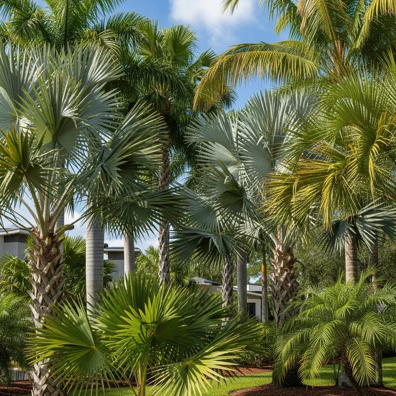 Move beyond green by selecting palms with colorful fronds that add unexpected hues to front yard palettes. Blue Hesper Palms, Silver Bismarck Palms, and Red Flame Palms provide color without relying on flowers that require deadheading. These colored palms become focal points that anchor entire landscape color schemes built around their unique hues. Pair silver palms with purple plants for sophisticated cool-toned gardens, or combine red palms with orange flowers for sunset-inspired warmth. The permanent color of palm fronds means consistent visual impact regardless of blooming seasons or weather conditions. Colored palms work especially well against neutral house colors where they won't compete with existing architectural elements. Include complementary colored mulches or rocks that enhance palm colors while maintaining cohesive designs throughout your front yard.