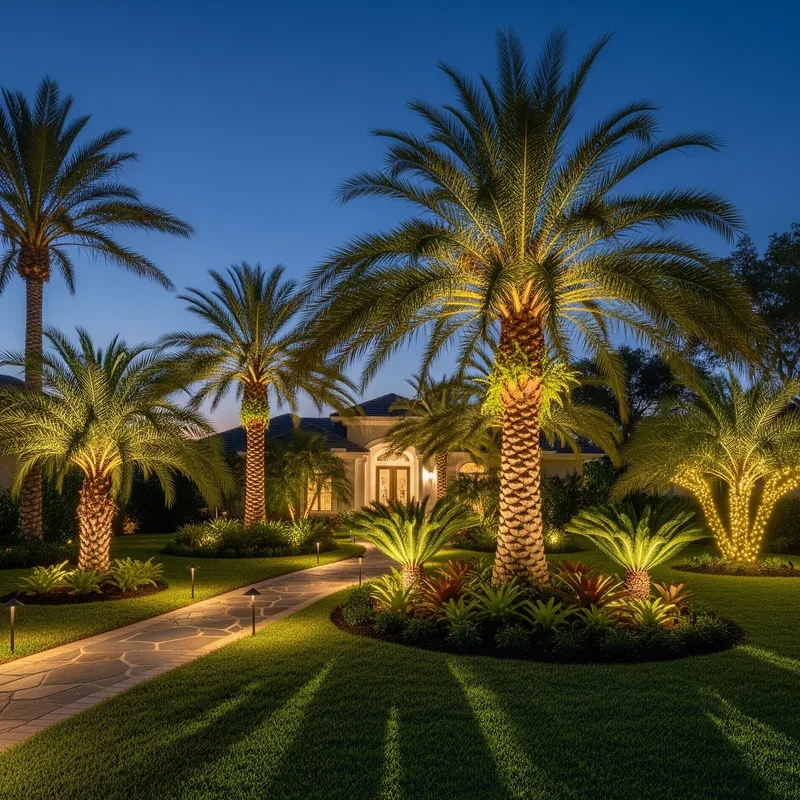 Illuminate your palms after dark to create dramatic silhouettes that transform your front yard into a nighttime wonderland. Install uplights at palm bases to highlight textured trunks and cast spectacular frond shadows on your home's facade. LED spots with warm color temperatures create inviting glows without harsh glares that destroy ambiance. Consider color-changing smart bulbs for holiday seasons or special occasions when you want extra festive flair. String lights wrapped around trunks add whimsical touches perfect for year-round enchantment, not just holidays. Solar-powered options eliminate wiring hassles while reducing energy costs for all-night illumination. The key is layering different light types: uplighting for drama, path lights for safety, and accent lights for special features. Well-lit palms become architectural elements that extend your home's living space into the night.