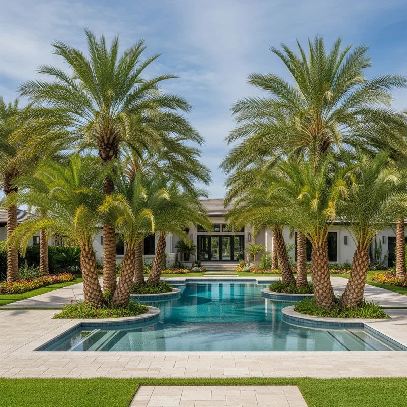 Lucky enough to have a front yard pool? Palms are your perfect partners for creating resort atmospheres that make every day feel like vacation. Position palms to provide afternoon shade over lounging areas without dropping leaves directly into pools. Cluster different heights around pool equipment to hide pumps and filters while maintaining easy access for service. Choose clean palms like Pygmy Dates or Bottle Palms that don't constantly shed debris into water. The reflection of palms in pool water doubles their visual impact, especially when lit at night. Create privacy screens with closely planted palms that block street views while maintaining breezy tropical feelings. Include poolside planters with smaller palms that can be moved for parties or maintenance needs. The combination of water and palms triggers deep relaxation responses that transform front yards into therapeutic spaces.