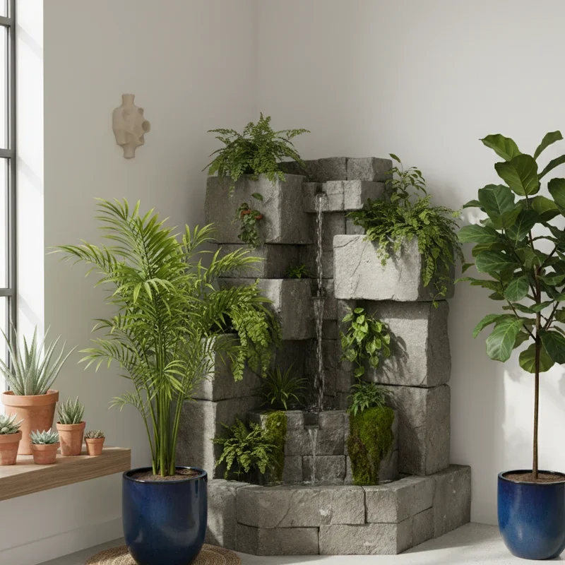 Combine the soothing sounds of water with lush plant life to create a multi-sensory corner experience that engages sight, sound, and even touch. Install a small tabletop fountain or floor-standing water feature and surround it with tropical plants that appreciate the increased humidity, such as ferns, calatheas, or anthuriums. The gentle trickling of water creates white noise that masks household sounds, promotes relaxation, and provides a meditative focal point. The moisture generated by the fountain benefits nearby plants, reducing watering frequency while promoting healthier growth. Position smooth river rocks, decorative pebbles, or beach glass around the base to enhance the natural aesthetic. This corner becomes your personal meditation space, offering a daily escape to tranquility without leaving home. Add subtle LED lighting for enchanting evening ambiance.