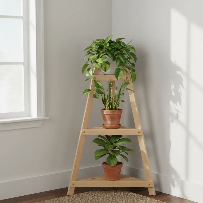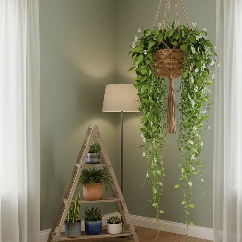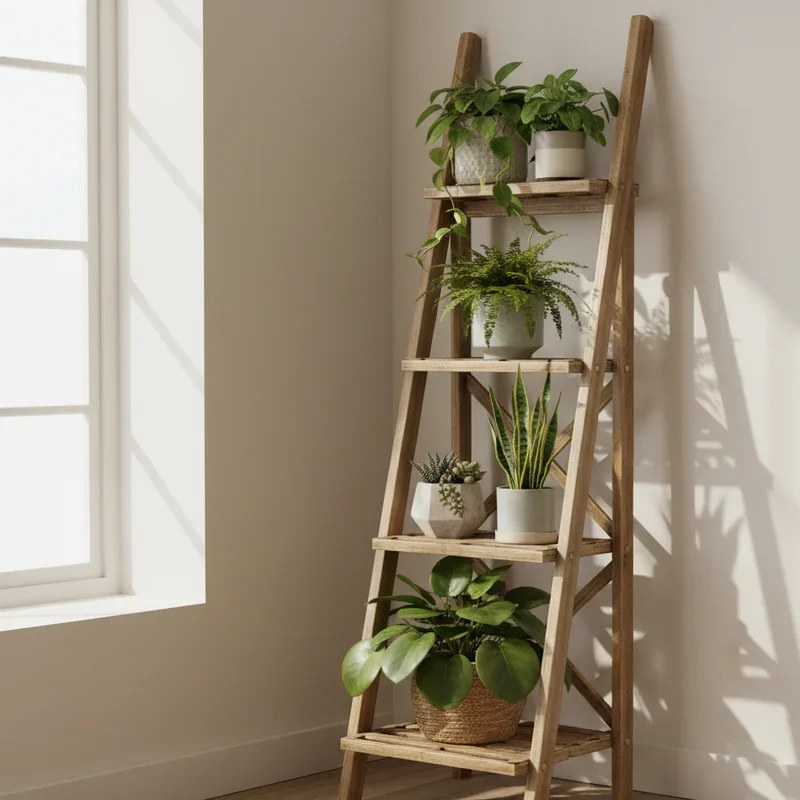 Repurposed ladders or ladder-style shelving units bring rustic charm and vertical growing space to any corner. This trendy solution combines functionality with aesthetics, offering multiple levels for plant display while maintaining an open, airy feel that doesn't overwhelm smaller rooms. Lean a vintage wooden ladder against the wall and place plants on each rung, or invest in a purpose-built ladder shelf designed specifically for plant display. The angled structure creates visual interest while ensuring each plant receives adequate light from above. Mix plant sizes and varieties to create rhythm and balance. Add trailing plants on upper rungs to soften the rigid ladder structure, and place larger, bushier plants on lower shelves for stability. This approach works beautifully in farmhouse, industrial, or eclectic interiors where character and personality matter most.