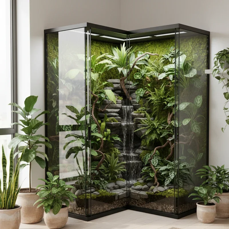 Terrariums bring a touch of miniature magic to plant corners, creating self-contained ecosystems that require minimal maintenance while delivering maximum visual impact. Group several terrariums of varying sizes and shapes on a corner table or shelf to create an enchanting display that invites closer inspection. Glass vessels showcase the layers of soil, rocks, and moss while protecting delicate plants from drafts and dry air. Choose closed terrariums for humidity-loving plants like fittonia and ferns, or open terrariums for succulents and air plants. The transparent nature of terrariums allows you to appreciate every detail of your tiny gardens, from root systems to condensation patterns. This approach is perfect for corners with limited natural light since you can supplement with LED grow lights hidden within the display.