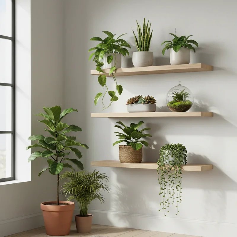 Floating shelves offer incredible versatility for creating dynamic plant corners that showcase your collection beautifully. Install two to five shelves at varying heights and depths to create a staggered, three-dimensional display that catches attention from every angle. This arrangement allows you to group plants with similar care requirements while creating visual rhythm through repetition and variation. Place taller plants on lower shelves and trailing varieties on upper shelves for a balanced composition. Mix in decorative elements like small sculptures, candles, or books to prevent the display from feeling too monotonous. The open nature of floating shelves ensures adequate air circulation around your plants, promoting healthier growth. This solution works exceptionally well in modern, contemporary, or Scandinavian-inspired interiors where clean lines and minimalist aesthetics reign supreme.