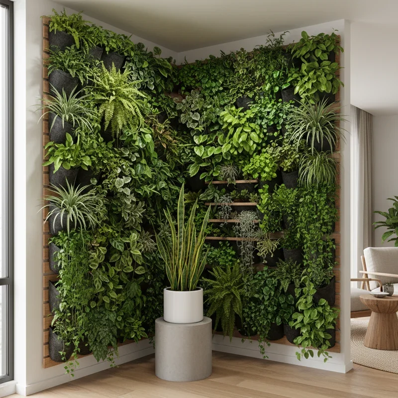 Why limit yourself to horizontal space when you can grow upward? Vertical garden walls maximize your corner's potential by utilizing every inch from floor to ceiling. Install a modular wall planter system, create a DIY pallet garden, or use individual wall-mounted pots arranged in an artistic pattern. This approach works brilliantly for smaller homes where floor space is precious. Choose trailing plants like pothos, philodendrons, or string of pearls for a cascading effect that softens architectural lines. Mix in some textured varieties like ferns or peperomias to create visual interest. The result is a living art installation that purifies your air while serving as a stunning focal point. Plus, vertical gardens make watering easier since you can install a drip irrigation system that does the work for you.