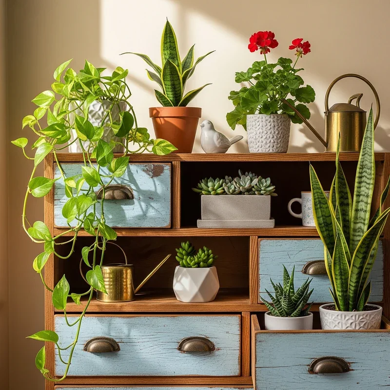 Give old furniture new life as unique plant displays that tell stories while showcasing your green collection. These one-of-a-kind pieces add character that new furniture simply can't replicate! Old dressers with drawers removed become perfect cubby systems for potted plants. Vintage bar carts offer mobile gardens that can follow the sun throughout your home. Antique washstands provide multiple levels with built-in charm and patina. The weathered finishes complement the organic nature of plants beautifully. Each piece brings history and uniqueness that makes your plant display truly personal. Scout flea markets and estate sales for pieces with good bones but cosmetic challenges. The imperfections add authenticity that perfectly frames nature's imperfect beauty. Your plant shelf becomes a conversation starter that combines sustainability with style.