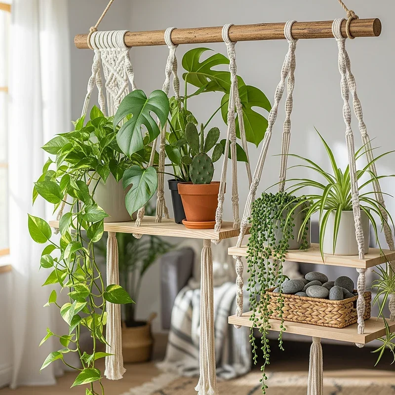 Blend the art of macramé with practical shelving for a bohemian display that adds textile interest to your plant presentation. These handcrafted pieces bring warmth and personality that mass-produced shelves can't match! Combine traditional macramé hangers with wooden shelves for multi-level displays. The rope work creates visual softness that contrasts beautifully with structured shelving. Natural cotton or jute fibers in cream, beige, or dyed colors complement any decor. The handmade quality adds artisanal charm that makes your space feel curated and intentional. Mix different knot patterns for visual variety across your display. The flexibility allows for adjustable heights as plants grow or seasons change. Include beads, tassels, or shells in your macramé for extra decorative elements. Your plant shelf becomes a textile artwork that celebrates both craft and nature.