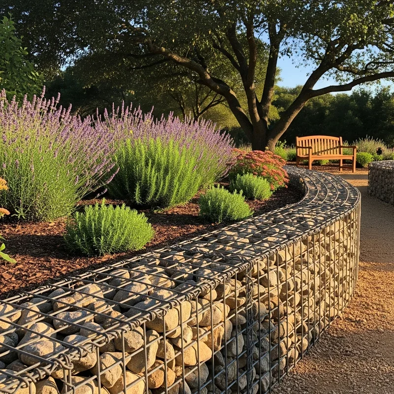 Create modern rustic borders with wire cages filled with stones, combining industrial structure with natural materials perfectly. These modular systems allow incredible flexibility in height, width, and fill materials from river rocks to recycled concrete. The cage structure means no mortar or precise stacking required, making installation faster than traditional stone walls. Fill gabions with different materials in sections for striped effects, or graduate from large to small stones for subtle texture variations. The spaces between stones provide habitat for beneficial insects and small wildlife that support garden ecosystems. Gabions work especially well on slopes where they provide both edging and erosion control simultaneously. The industrial mesh softens over time with rust or vine growth, eventually disappearing behind plants while maintaining structural integrity.
