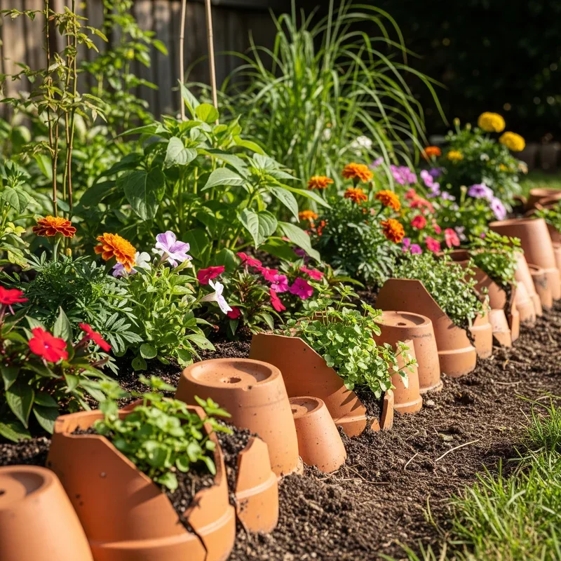 Repurpose broken or surplus terracotta pots into charming borders that celebrate gardening itself as decorative element. Bury pots halfway at angles for scalloped effects, or stack various sizes for dimensional borders with built-in planting pockets. The warm orange tones complement green foliage perfectly while aging beautifully with white mineral deposits and moss growth. Fill visible pots with trailing plants, succulents, or seasonal annuals for borders that double as mini garden beds. Old pots with chips and cracks add character that new pots lack, turning imperfections into rustic charm. The porous clay helps regulate moisture and provides beneficial minerals as it slowly breaks down over many years. This edging particularly suits Mediterranean, cottage, or herb gardens where terracotta's traditional associations enhance overall themes.