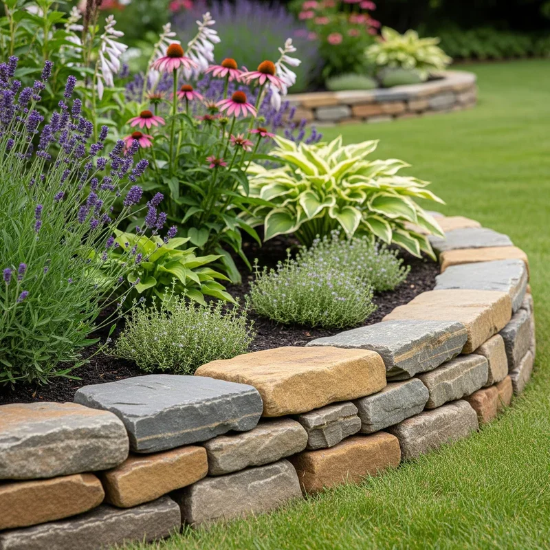 Stack flat fieldstones like nature's own puzzle pieces to create borders that look like they've been there since the ice age. These stones don't need mortar; gravity and strategic placement keep them stable while allowing flexibility for future adjustments. Collect stones from your property or source them locally to ensure they match your region's geological character. Vary the heights for visual interest, placing larger stones at curves or corners for stability and impact. The irregular shapes create pockets perfect for tucking in creeping thyme or sedums that soften harsh edges. Over time, lichens and moss colonize the surfaces, adding patina that money can't buy. This edging works brilliantly for cottage gardens, woodland paths, or anywhere you want that "discovered ruins" aesthetic. The thermal mass of stones also creates microclimates, warming soil in spring and protecting roots in winter.
