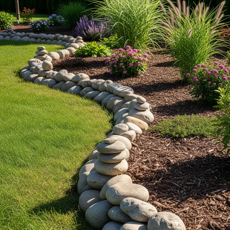Smooth river rocks create zen-like borders that bring serenity and natural flow to garden designs. These water-worn stones come in various sizes and colors, from tiny pebbles to bowling ball boulders, allowing creative graduated effects. Dig shallow trenches and fill with rocks for permanent borders that never need replacing or maintenance beyond occasional repositioning. The spaces between rocks provide excellent drainage, preventing water from pooling and causing root rot in adjacent plants. Choose local river rock to ensure your edging harmonizes with regional landscapes rather than looking imported or forced. Dark wet-look sealers enhance natural colors if you prefer more dramatic effects, though many gardeners love the subtle, sun-bleached appearance. River rocks also work brilliantly as mulch within borders, creating unified designs that blur lines between edging and garden bed.