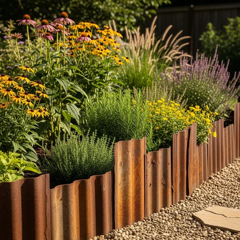 Rescue old roofing tin, salvaged steel strips, or weathered copper from scrapyards to create edging with industrial patina. The rust and verdigris add colors that complement both flowers and foliage while telling stories of previous lives. Partially bury metal strips vertically for clean lines that slice through landscapes with surgical precision contrasting organic plant forms. The thin profiles take minimal space while providing excellent root barriers that prevent grass invasion into beds. Metal conducts heat, warming soil in spring for earlier blooming and extended growing seasons near edges. Cut or bend pieces for curves, corners, or height variations that follow landscape contours naturally. Some metals like copper naturally repel slugs and snails, providing pest control bonus alongside decorative function.