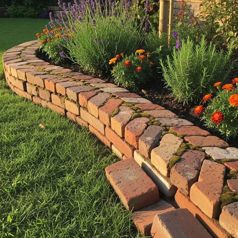 Old bricks carry stories in their chips and weathered surfaces, bringing instant history to garden borders. Salvage them from demolition sites, old chimneys, or architectural salvage yards where imperfect bricks sell for fraction of new prices. Stand them on end for sawtooth patterns, lay them flat for broader borders, or angle them for diagonal designs that create visual movement. The warm terracotta tones complement both cool green foliage and hot-colored blooms equally well. Mismatched bricks from different sources add character that uniform new bricks lack, creating borders that look accumulated over generations. The porous nature of old bricks absorbs and releases moisture, helping regulate soil conditions near border edges. Some vintage bricks feature maker's stamps or unique glazes that become conversation starters during garden tours.