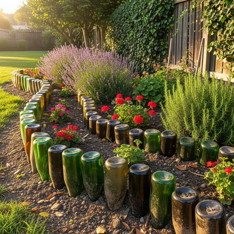 Turn empty bottles into colorful borders that catch light and create unexpected garden sparkle. Bury bottles neck-down for stable edging that won't tip or roll, creating rows of glass circles that look like giant gems. Green, brown, and clear bottles offer different effects; mix colors for playful borders or stick to one shade for sophisticated monotone designs. The glass creates interesting light patterns throughout the day as sun angles change, adding dynamic element to static borders. This recycling solution costs nothing if you save bottles or ask restaurants for their empties, turning waste into garden art. The thermal mass of glass helps moderate soil temperatures, protecting roots from extreme temperature swings. Consider LED string lights behind translucent bottles for magical nighttime effects that transform gardens into fairyland settings.