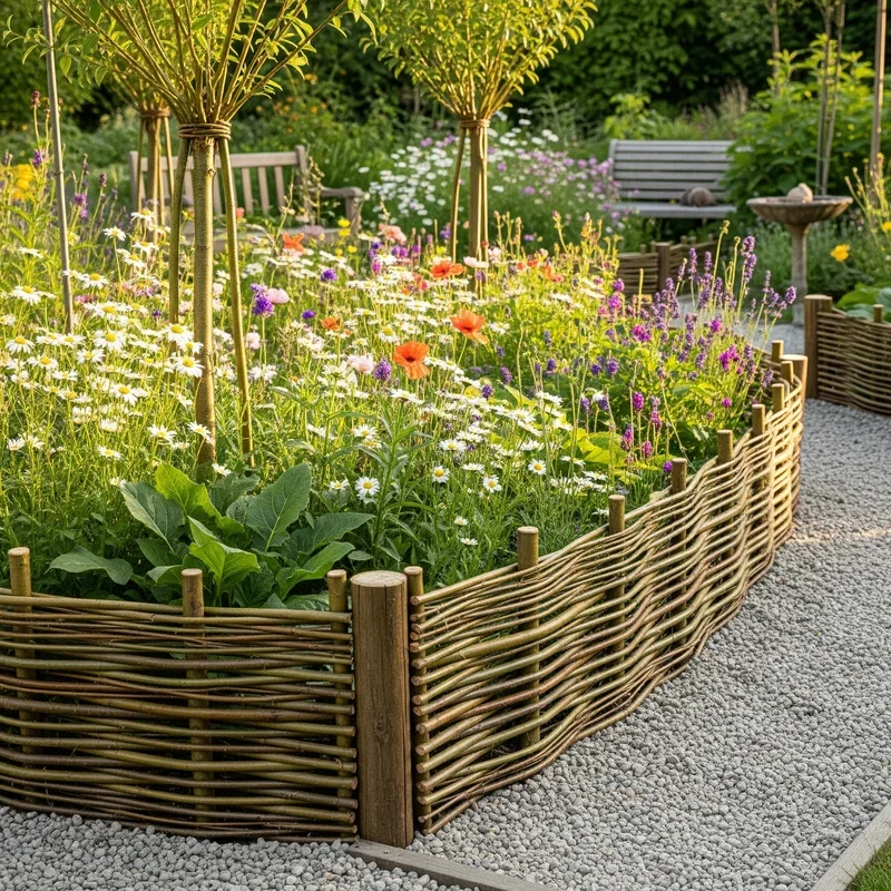Channel ancient garden traditions with wattle fencing techniques that transform pruned branches into living art. Weave flexible willow, hazel, or even grapevines between stakes to create borders that look like they've been lifted from a medieval monastery garden. This technique costs virtually nothing if you have access to suitable branches, turning yard waste into functional beauty. The height is completely customizable; make them low for subtle definition or tall for mini-fence effects that keep rabbits at bay. Fresh willow branches might actually root and sprout, creating living fences that change through seasons. The woven texture provides perfect support for climbing plants like sweet peas or nasturtiums that thread through gaps. Replace sections as needed without dismantling entire borders, making maintenance refreshingly simple. This edging biodegrades naturally, enriching soil as it decomposes over several years.
