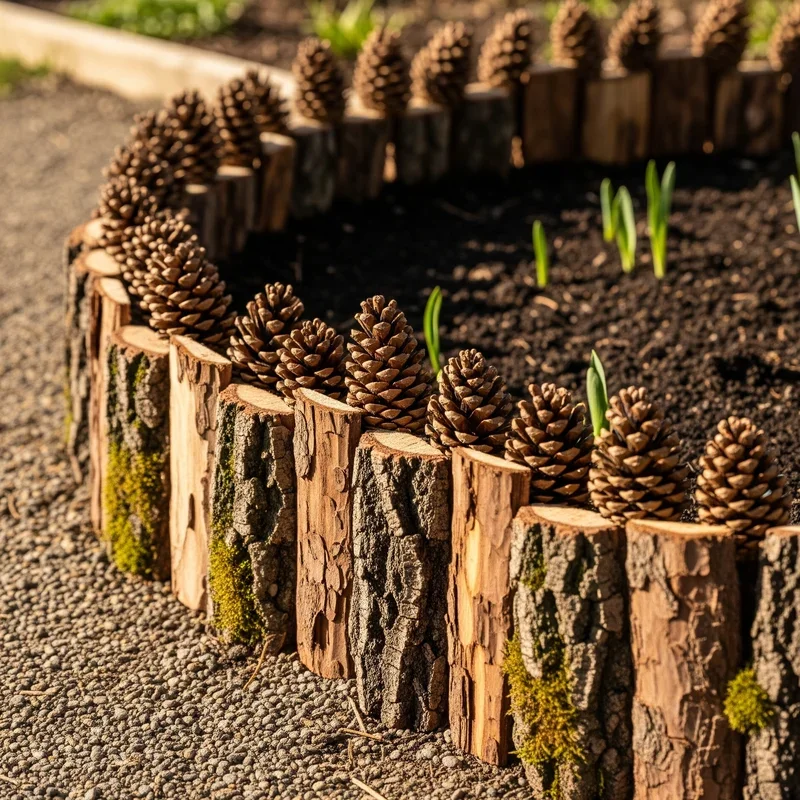 Gather pine cones, bark chunks, and other forest floor materials for borders that smell as good as they look. These lightweight materials work perfectly for temporary or seasonal edging you can change with moods or garden evolution. Large pine cones stood on end create textured borders that catch rain and slowly release moisture to nearby plants. Mix different cone types and sizes for varied textures that prevent monotony along longer borders. The natural browns blend seamlessly with mulch while providing clear definition between lawn and beds. As organic materials, they decompose slowly, enriching soil and supporting mycorrhizal fungi networks that benefit plant health. This free edging solution simply requires collection time and works especially well in woodland or native plant gardens where it enhances naturalistic themes.