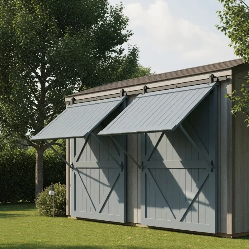 Combine function with farmhouse charm by installing sliding awnings that operate like barn doors, gliding along tracks to provide coverage when needed. These innovative designs mount above shed entrances and slide horizontally, offering adjustable shade and weather protection. When not in use, they slide to the side, maintaining your shed's clean lines. The sliding mechanism works perfectly for narrow spaces where traditional awnings might obstruct pathways. Build them using reclaimed wood for authentic rustic appeal or modern materials for contemporary style. The tracks can be decorative elements themselves, adding industrial touches that enhance your shed's character. This unique solution provides the flexibility of retractable awnings with the solid protection of permanent structures. Add windows or cutouts to the sliding panels for partial light while maintaining protection.