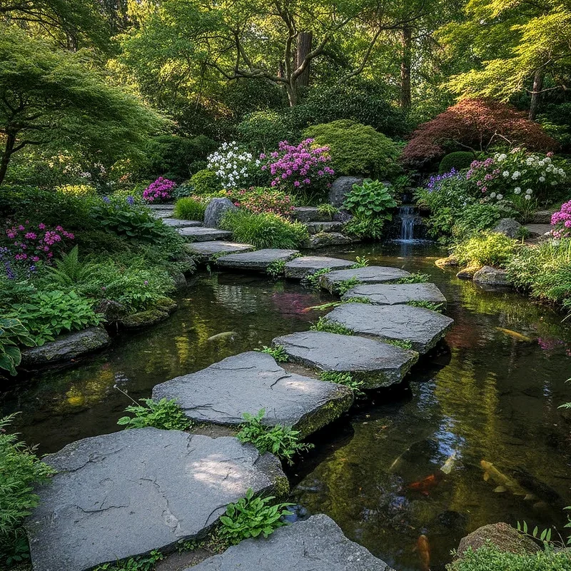 Create an illusion of walking on water with a floating stepping stone bridge that combines functionality with visual drama in your garden. These bridges use individual platforms that appear to float on the water's surface, whether actually floating or supported by hidden structures beneath. The spacing between stones adds excitement and encourages mindful movement through your garden, turning a simple crossing into an engaging experience. Materials range from concrete pavers to natural stone or even recycled materials like old millstones, each offering unique aesthetic possibilities. This design works beautifully over shallow ponds, rain gardens, or dry creek beds filled with decorative pebbles, creating dynamic visual elements that change with viewing angles.