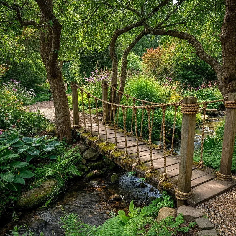 Add adventure and whimsy to your garden with a rope and plank bridge that evokes childhood treehouse memories and jungle expeditions. These playful structures combine sturdy wooden planks with rope railings, creating movement and excitement as visitors cross from one garden area to another. The flexible design allows for creative installation over various obstacles, from shallow streams to planted ravines or even level ground for pure decorative effect. Weather-resistant marine rope ensures durability while maintaining that nautical or adventure park aesthetic that children absolutely adore. This bridge style works wonderfully in family gardens, creating interactive elements that encourage exploration while serving as conversation starters during garden parties and gatherings.