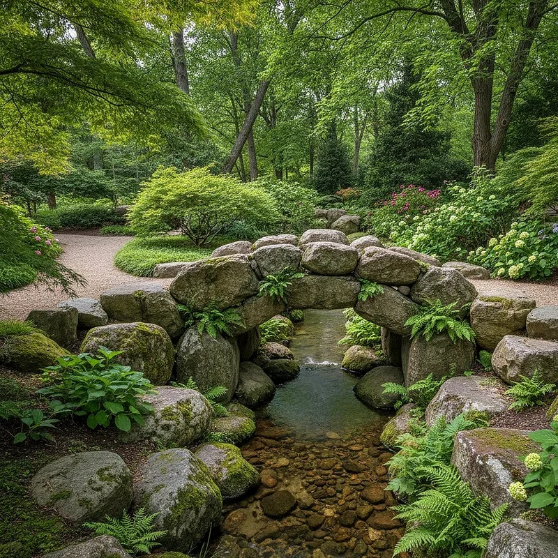 Harness the raw power of nature with a natural boulder bridge that appears carved by time and elements rather than human hands. These structures use large rocks or boulders as stepping stones or solid spans, creating organic transitions that blend seamlessly with naturalistic landscape designs. The irregular shapes and varied textures provide visual interest while offering stable, permanent crossing points that require virtually no maintenance once properly positioned. This style works exceptionally well in xeriscaped gardens, alpine settings, or anywhere you want to emphasize natural materials and minimize artificial elements. The spaces between boulders can harbor small plants or moss, further integrating the bridge into its surroundings while creating micro-habitats for beneficial garden creatures.