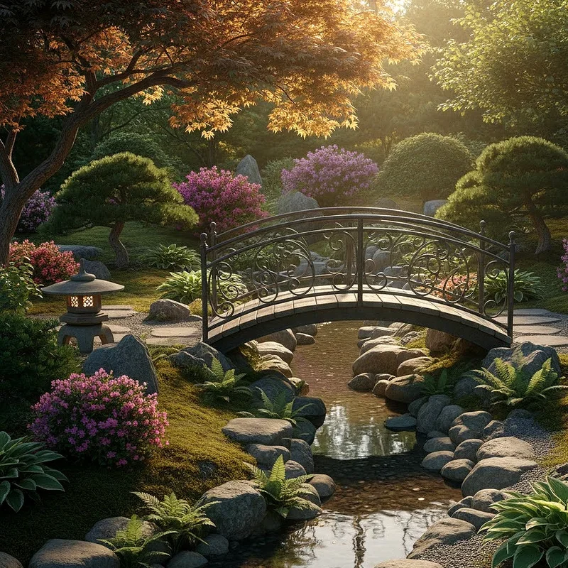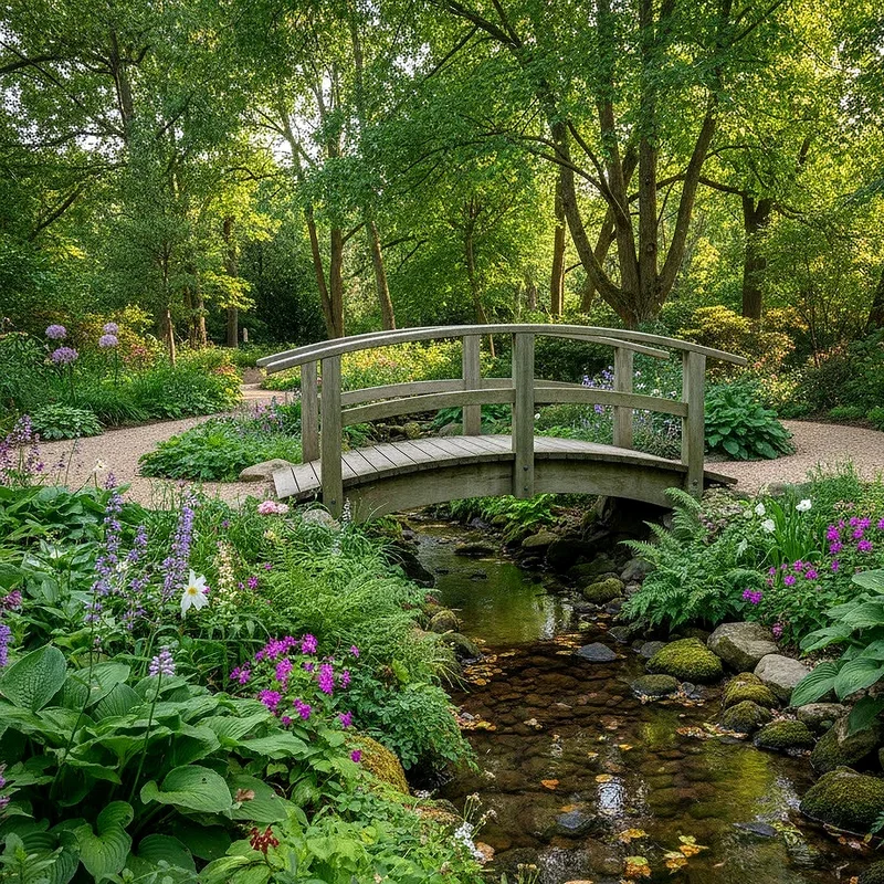 Create a sense of permanence and timelessness in your garden with a stone slab bridge that appears to have weathered centuries. These sturdy structures use large, flat stones spanning water features or garden paths, offering unmatched durability and minimal maintenance requirements. The natural variations in stone color and texture provide visual interest while complementing both formal and informal garden designs beautifully. Whether you choose granite, limestone, or sandstone, each material brings unique characteristics that enhance your landscape's overall aesthetic. Stone bridges work exceptionally well in rock gardens, alpine settings, or Mediterranean-inspired landscapes where their solid presence anchors the design while allowing surrounding plants to soften their edges naturally.