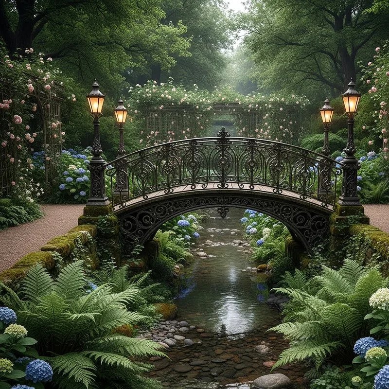 Transport your garden to a bygone era with a Victorian-style ornate bridge featuring elaborate scrollwork, decorative railings, and romantic design elements. These statement pieces showcase intricate metalwork or carved wooden details that recall the grandeur of nineteenth-century estate gardens and public parks. The ornamental nature of these bridges makes them perfect centerpieces for formal gardens where they can serve as destinations rather than mere crossings. Paint choices like classic white, deep green, or black enhance the period aesthetic while protecting materials from weather damage over time. Surround these bridges with cottage garden plantings, climbing roses, and vintage garden ornaments to complete the romantic atmosphere that makes visitors feel they've stepped into a historical romance novel.