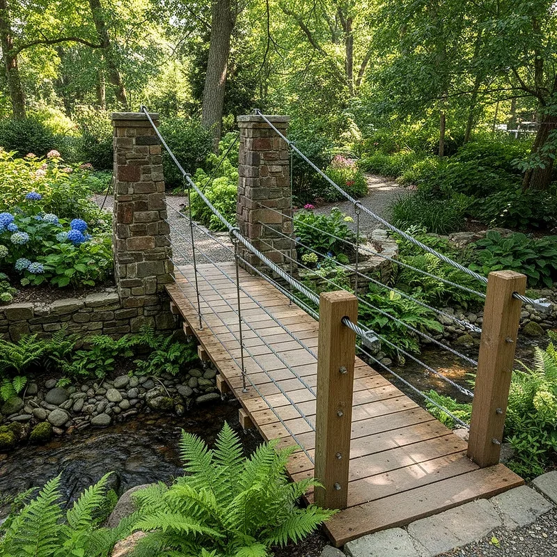 Challenge your construction skills and create a dramatic focal point with a DIY cable suspension bridge that brings architectural drama to your garden. These bridges use tensioned cables to support the deck, creating an impressive span that appears to defy gravity while remaining surprisingly stable. The engineering principles behind suspension bridges scale down beautifully for garden applications, allowing ambitious DIYers to create professional-looking structures with proper planning. Steel cables and turnbuckles provide adjustable tension while wooden or composite decking creates comfortable walking surfaces that weather beautifully outdoors. This bridge style makes stunning statements over ravines, larger ponds, or simply as sculptural elements that demonstrate your craftsmanship while providing functional garden access.