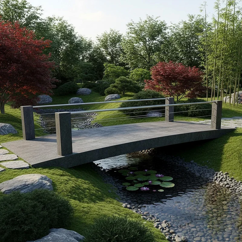 Safety meets style in a curved footbridge with railings that provides secure passage while adding elegant architectural interest to your landscape. These bridges feature gentle curves that guide the eye through your garden while sturdy railings offer support and confidence for visitors of all ages. The combination of form and function makes these bridges ideal for spanning actual water features or areas with elevation changes where safety becomes paramount. You can customize railing designs from simple horizontal bars to elaborate patterns that complement your garden's overall theme and style. The curved profile creates visual flow that softens angular landscape elements while the railings provide perfect support for climbing plants like clematis or jasmine.
