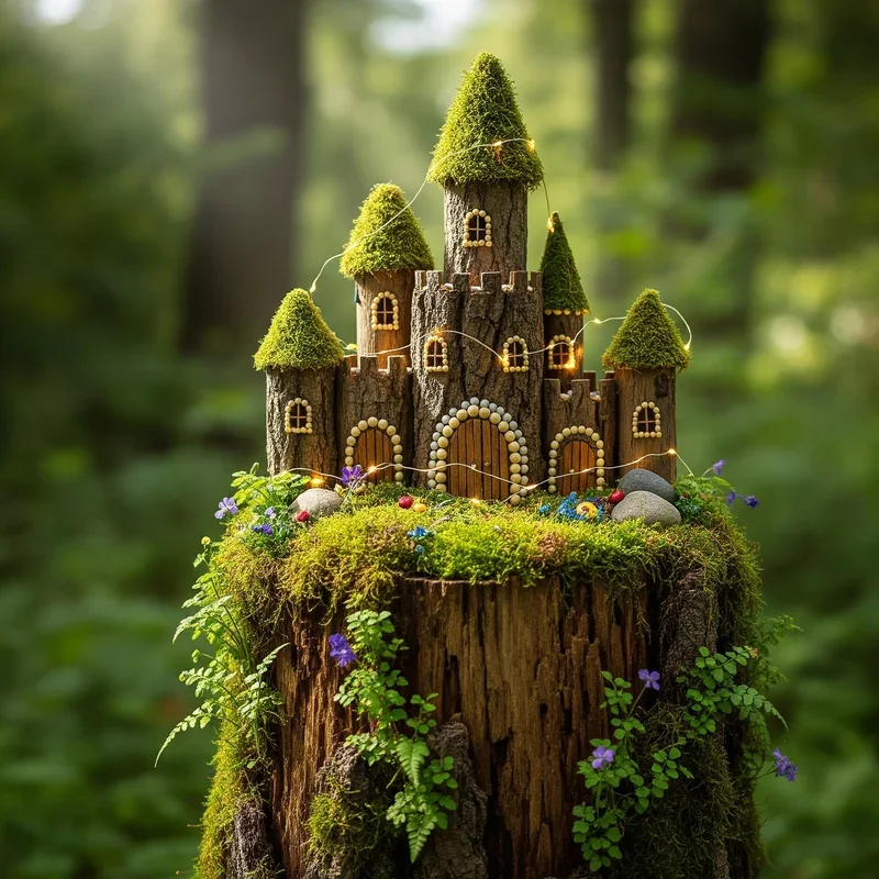 Turn your tall stump into an enchanted fairy tale kingdom that captures imagination and adds magic to your garden. This is where childhood dreams meet garden design! Start by creating tiny doors and windows using craft wood or purchased fairy door kits. Add miniature staircases spiraling up the stump using small twigs and hot glue. The height provides multiple levels for different fairy "apartments" or scenes. Paint whimsical details or leave it natural for an authentic woodland feel. Surround the base with miniature plants like baby tears or Irish moss to create fairy lawns. Add tiny LED lights for nighttime enchantment that makes the whole structure glow mysteriously. Small mushroom decorations, miniature furniture, and tiny garden tools complete the scene. Your stump becomes a conversation starter that delights visitors of all ages.