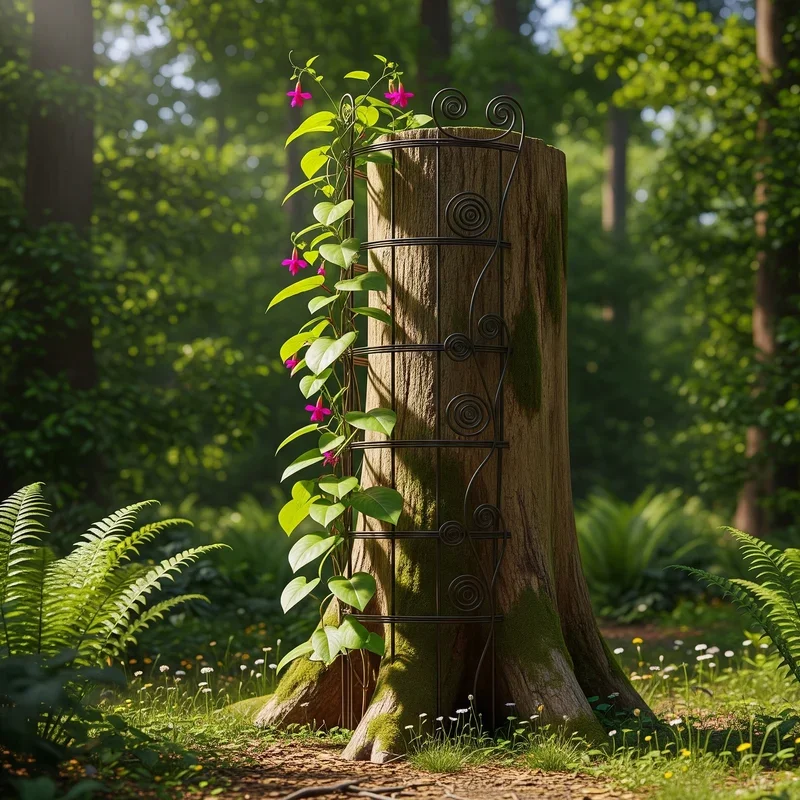 Transform your tall stump into a natural trellis that supports climbing plants while adding vertical garden interest. This is recycling at its most beautiful! Attach wire mesh or install eye hooks with garden wire to create climbing routes. The rough bark provides natural grip for vines like clematis, morning glories, or climbing roses. The substantial structure supports heavy vines better than traditional lightweight trellises ever could. Create spiral patterns that guide plants upward in artistic swirls around the stump. The height allows climbing plants to cascade down dramatically once they reach the top. Combine flowering and foliage vines for multi-season interest and varied textures throughout. Your stump becomes a living pillar that changes personality as plants grow and seasons shift.