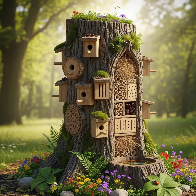 Create a thriving ecosystem by converting your tall stump into a multi-story wildlife hotel that supports biodiversity. This is conservation meets garden design! Drill various sized holes for solitary bees, beneficial insects, and small creatures seeking shelter. Add bark pieces, pine cones, and hollow bamboo stems to create different habitat niches. The height provides safety from ground predators while offering various microclimates for different species. Install small platforms for bird feeding or water stations at convenient heights. Leave some areas naturally decaying to attract decomposer insects that birds love eating. The structure becomes a year-round sanctuary supporting your garden's ecological balance naturally. Your stump becomes a bustling apartment complex for beneficial creatures that pollinate plants and control pests.