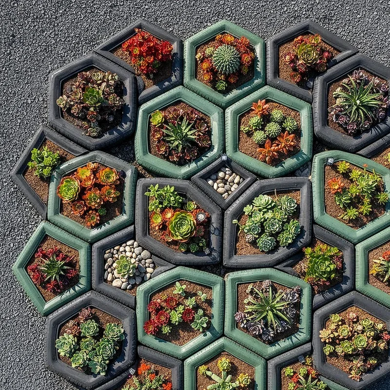 Embrace contemporary design with geometric tire arrangements that bring modern art to your landscape! Arrange tires in hexagonal patterns, straight lines, or abstract formations to create structured garden beds with clean, architectural appeal. Paint them in monochromatic schemes like all white or varying shades of gray for a sophisticated look that complements modern home designs. Fill with ornamental grasses, structured plants like boxwood, or minimalist succulent arrangements for a cohesive aesthetic. These geometric gardens work particularly well in urban settings where modern design is prevalent. The contrast between the industrial tire material and natural plants creates an intriguing juxtaposition that catches the eye. Your garden becomes a living sculpture that changes with the seasons!