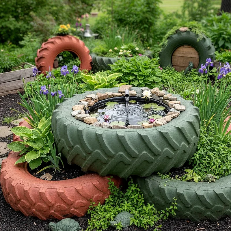 Transform your backyard into a tranquil oasis with a tire pond that brings the soothing sounds of water to your garden! Large tractor tires make excellent pond containers when lined with heavy-duty pond liner and partially buried in the ground. Add a small solar-powered fountain pump to create movement, preventing mosquito breeding while adding that peaceful bubbling sound we all love. Stock your tire pond with water lilies, lotus flowers, or even small goldfish for a complete ecosystem. Surround the edges with river rocks and moisture-loving plants like hostas or ferns to blend it naturally into your landscape. This project costs a fraction of traditional pond installation while delivering all the zen vibes.