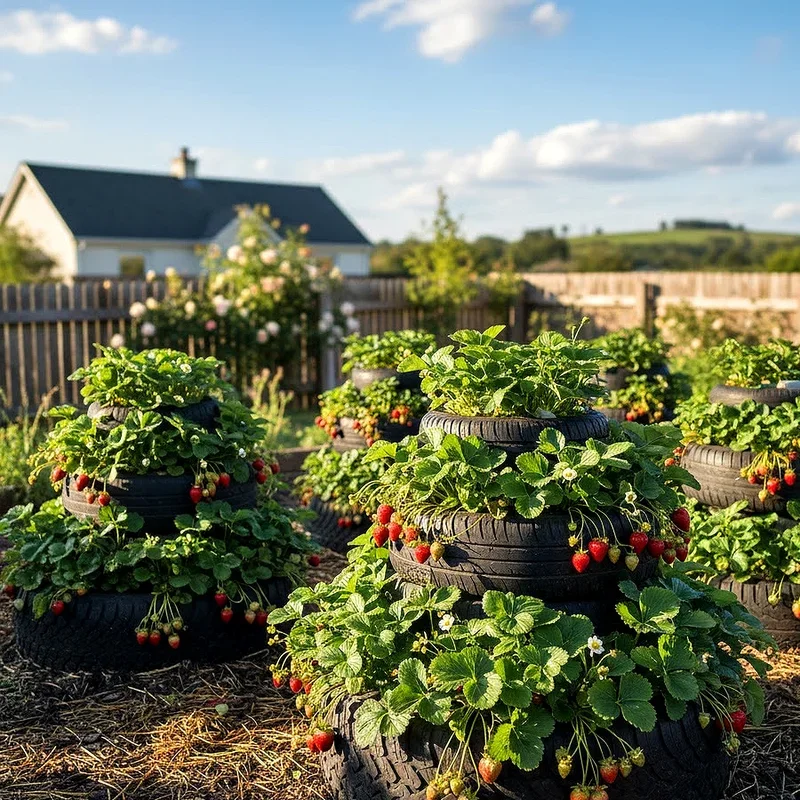 Get ready for the sweetest harvest with a tire strawberry pyramid that produces berries all season long! Stack progressively smaller tires to create a pyramid shape, filling each tier with rich, well-draining soil perfect for strawberry plants. The tiered design allows runners to cascade down naturally while maximizing sun exposure for each plant. You can fit twenty to thirty strawberry plants in a space that would normally hold just five or six! The black rubber absorbs and retains heat, extending your growing season and encouraging earlier fruit production. Position your pyramid in full sun and watch as it becomes covered in white blooms followed by juicy red berries. This design also works brilliantly for growing herbs, creating an attractive and accessible kitchen garden right outside your door.
