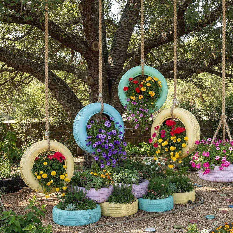 5. Whimsical Tire Swing Planters
