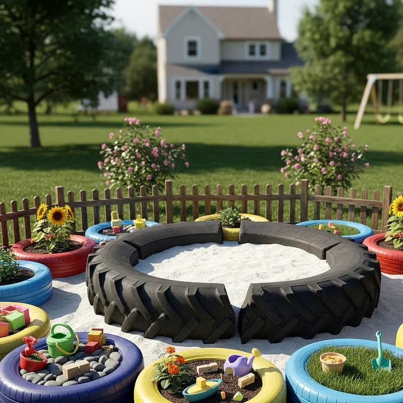 Combine playtime with garden time by creating tire sandbox gardens that teach kids about growing plants! Large tractor tires make perfect sandbox containers that can transition into garden beds as children grow. Start with sand for digging and castle building, then gradually introduce child-friendly plants like sunflowers, snap peas, and cherry tomatoes. Kids love having their own special garden space where they can dig, plant, and harvest without worrying about damaging other plants. Paint the tires in bright, cheerful colors or add fun designs like ladybugs and butterflies to make them even more appealing. These gardens teach responsibility, patience, and the joy of growing food while providing hours of outdoor entertainment away from screens.